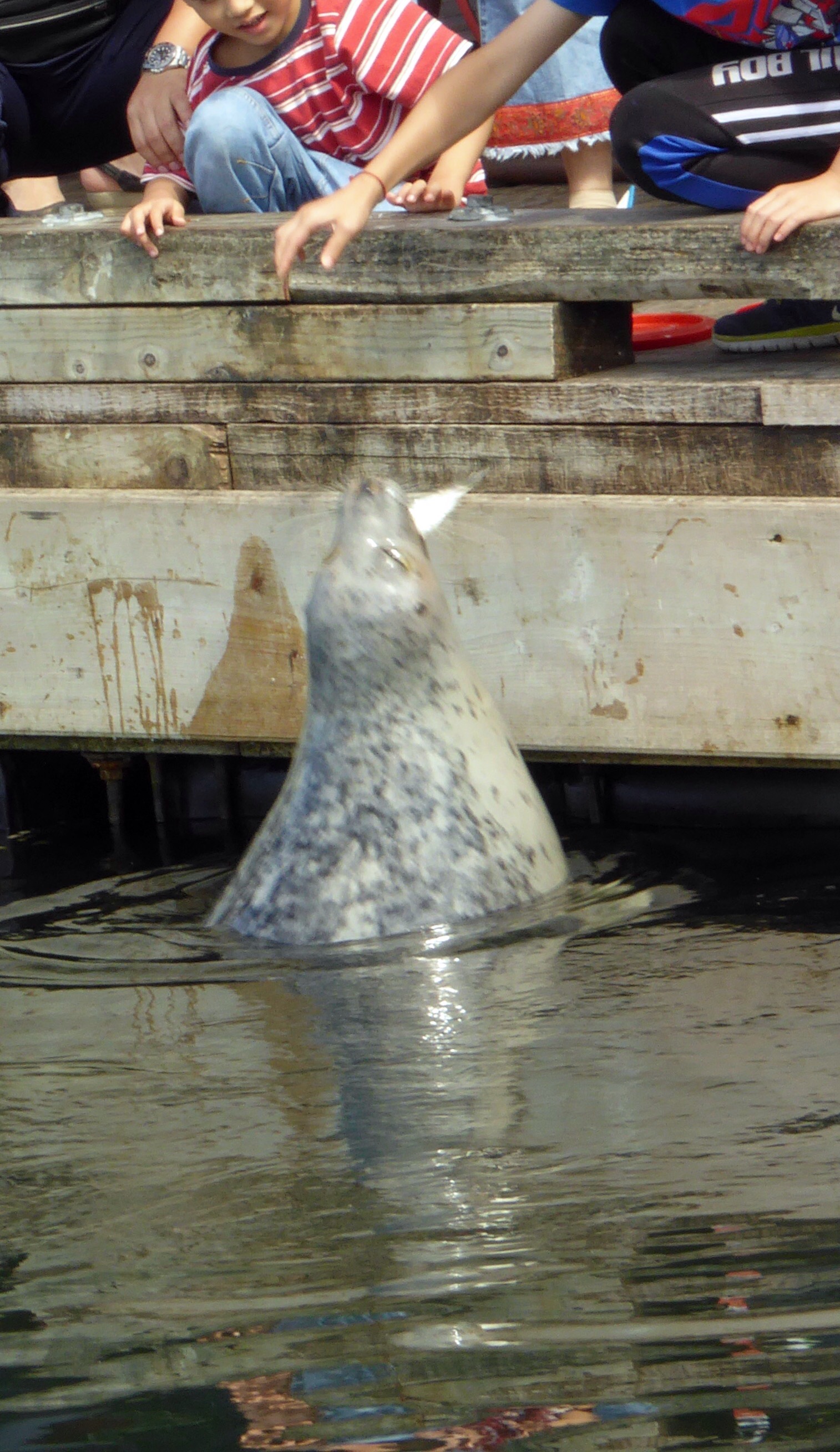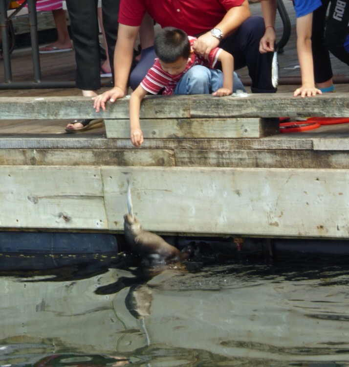 We walked on and saw children feeding a seal and a sea otter with fish. The seal was fat! His stomach was so full, he laid on his back in the water and looked as if he was going to pop! …. So comical