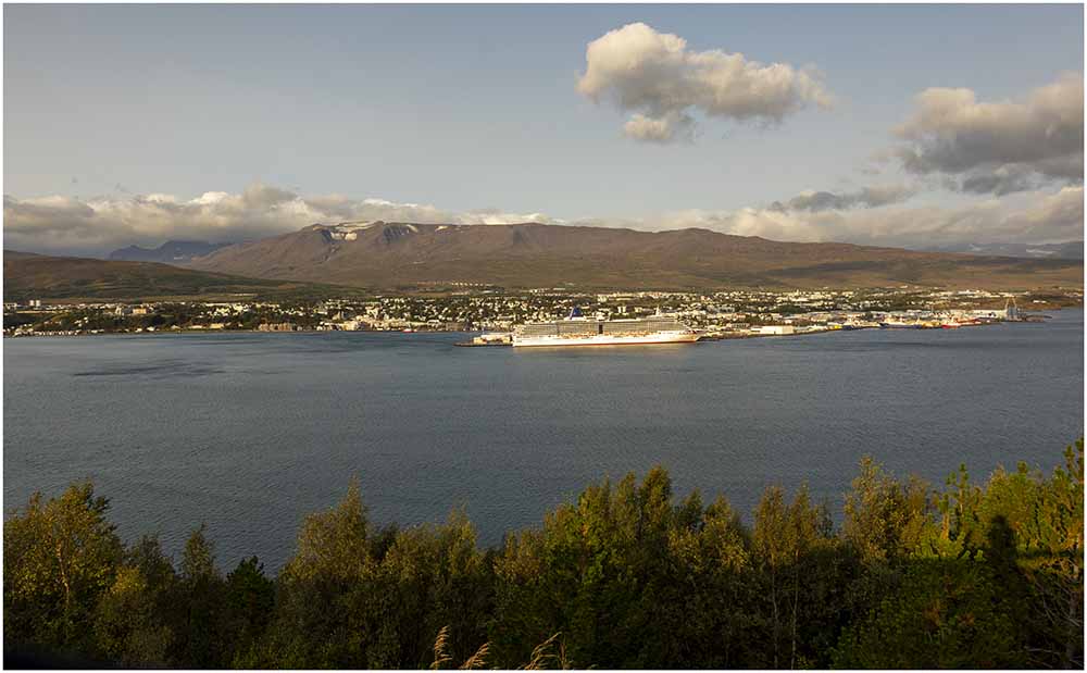 This is Akureyri as we left, cruise ship in and a sunny town. We took this from the top road as we left.
