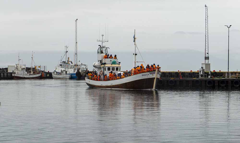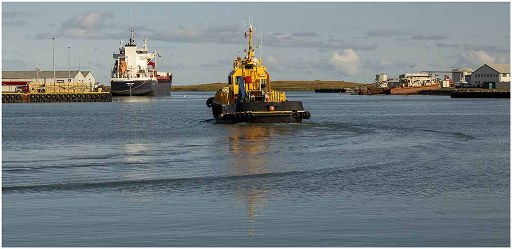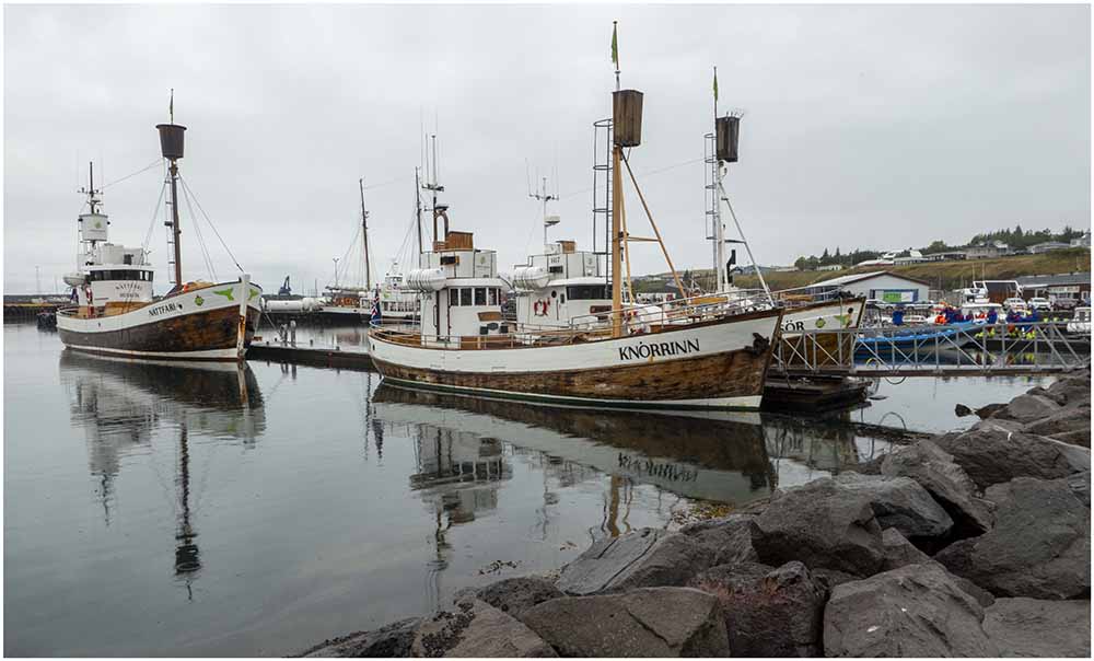 We went to a sea town called Husavik. There was no wind and so lovely reflections in the harbour. Here is popular for whale watching tours and we saw three boatloads going off and one returning.