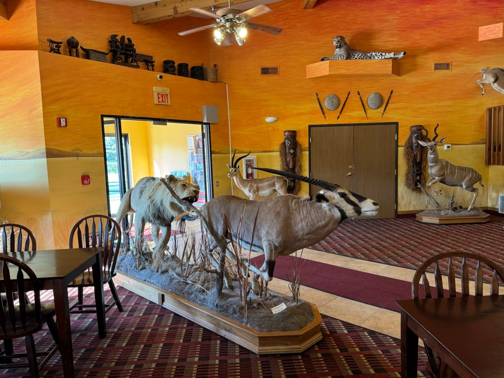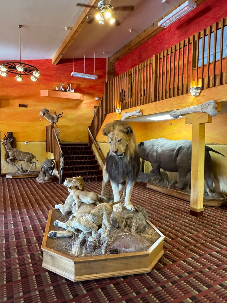 The entrance is full of taxidermy jungle animals and huge thigh bones all engraved and African artifacts displayed on all the walls and bannisters.